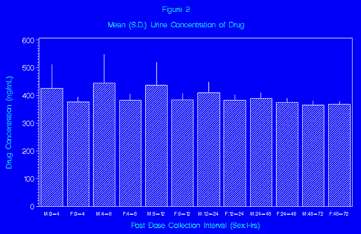 Bar Chart of Urine Drug Concentration Post-Dose Collections at 0 to 72 Hours in PK Studies (Standard Deviation plotted over Vertical Bars using annotation data sets in SAS)