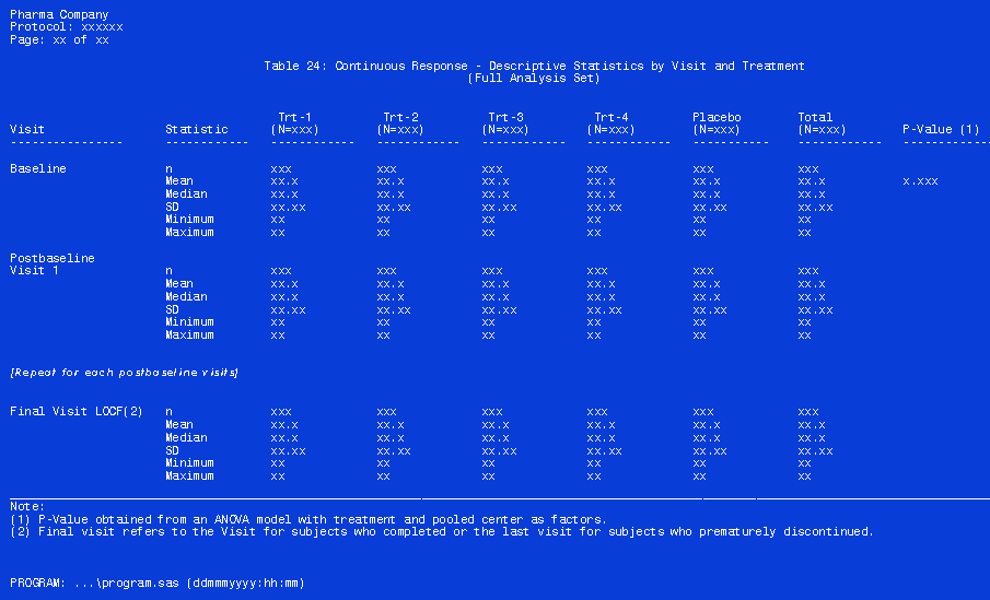 Continuous Response – Descriptive Statistics by Visit and Treatment