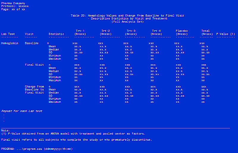 Hematology Values and Change from Baseline to Final Visit – Descriptive Statistics by Visit and Treatment